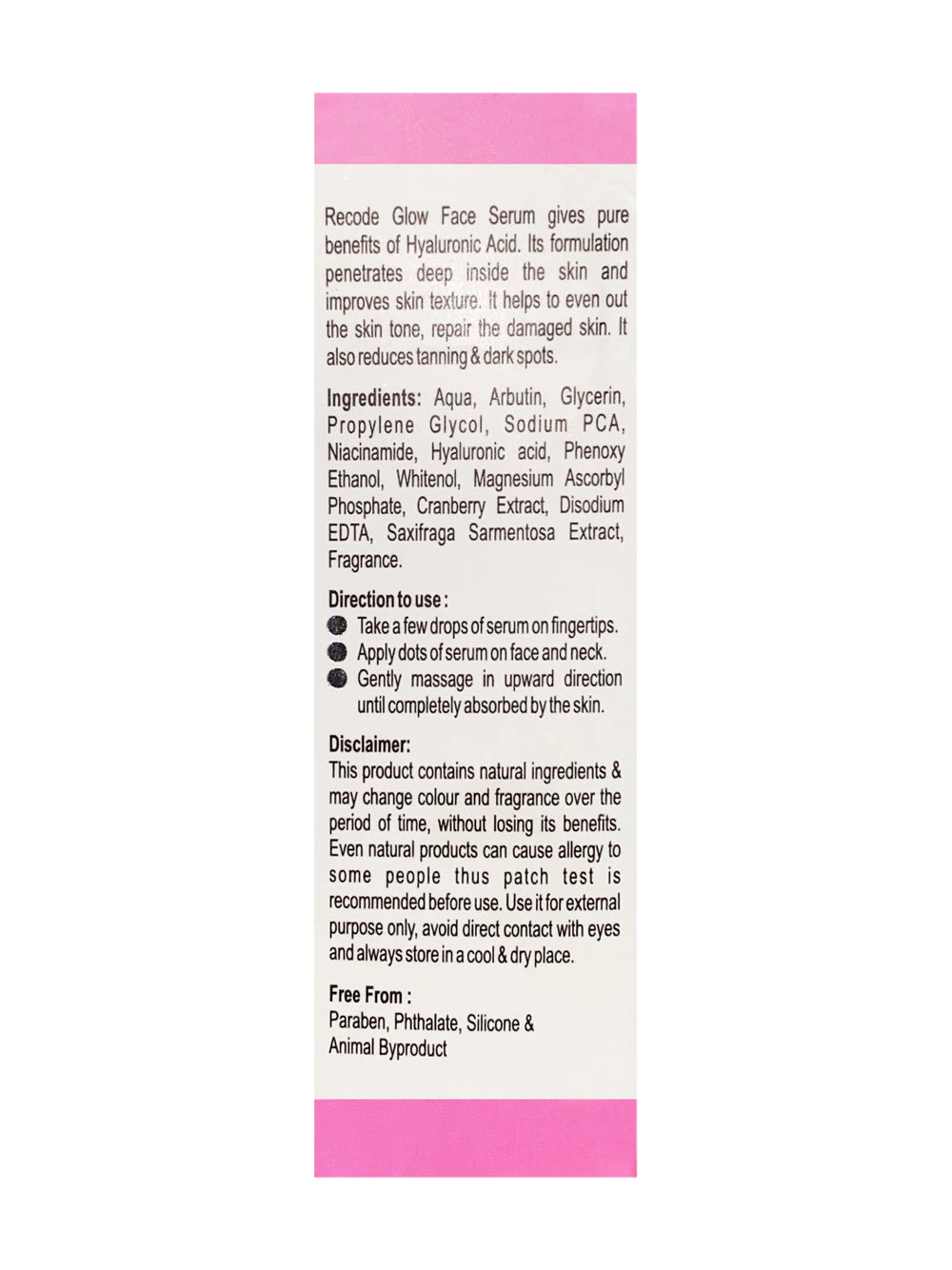 Unlock radiant, youthful skin with Recode Glow Face Serum, infused with 1.5% Hyaluronic Acid and 1% Saxifraga Sarmentosa Extract.