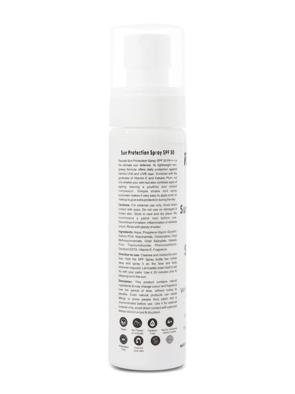 Recode sun protection spray SPF 50 PA+++ is a light weight, non greasy daily use formula which protects skin from harmful UVA and UVB rays. It is enriched with the goodness of kakadu plum, and vitamin E . It helps to avoid sun damage and fights signs of ageing.